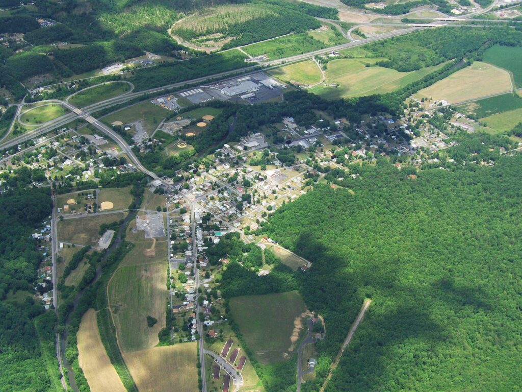Aerial view looking north towards Milesburg along State Route 144. Bald Eagle Ridge and Bellefonte are to the south. Spring Creek runs between the fields and forested area on the left side of the landscape, past the park, where it meets Bald Eagle Creek.